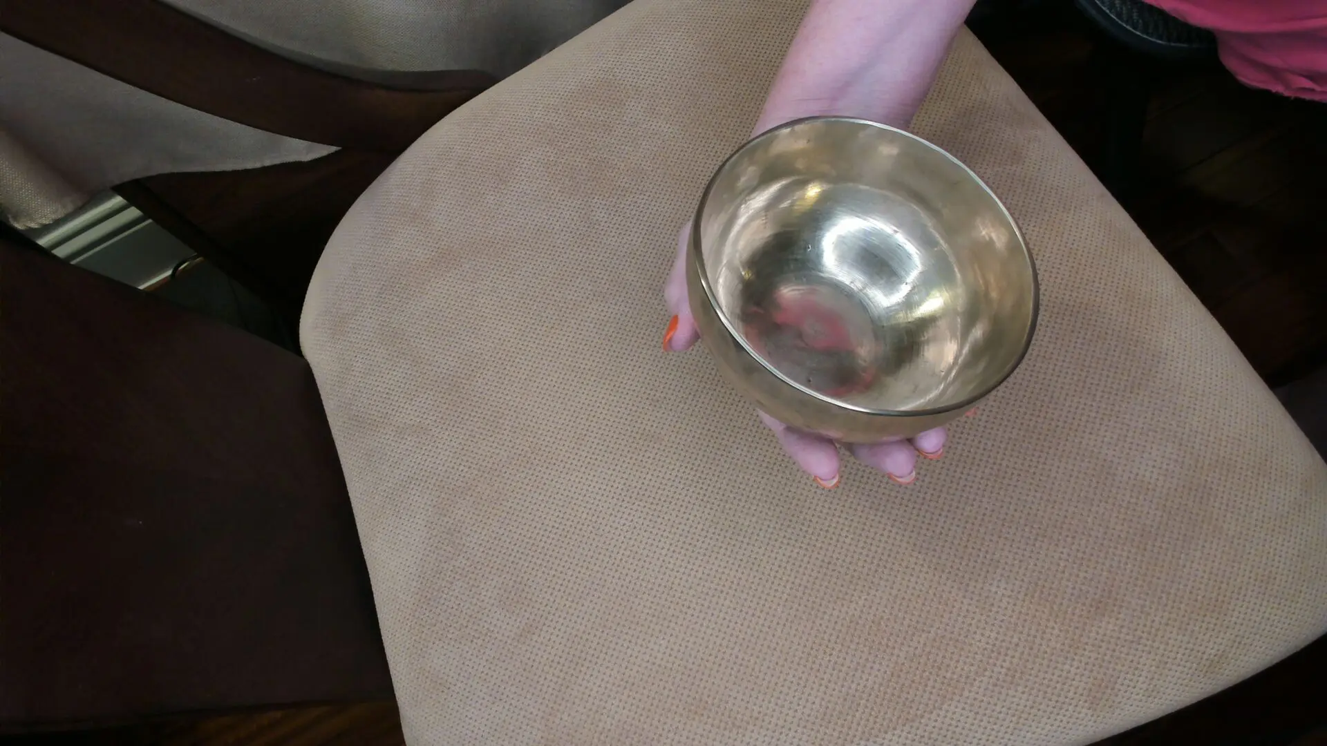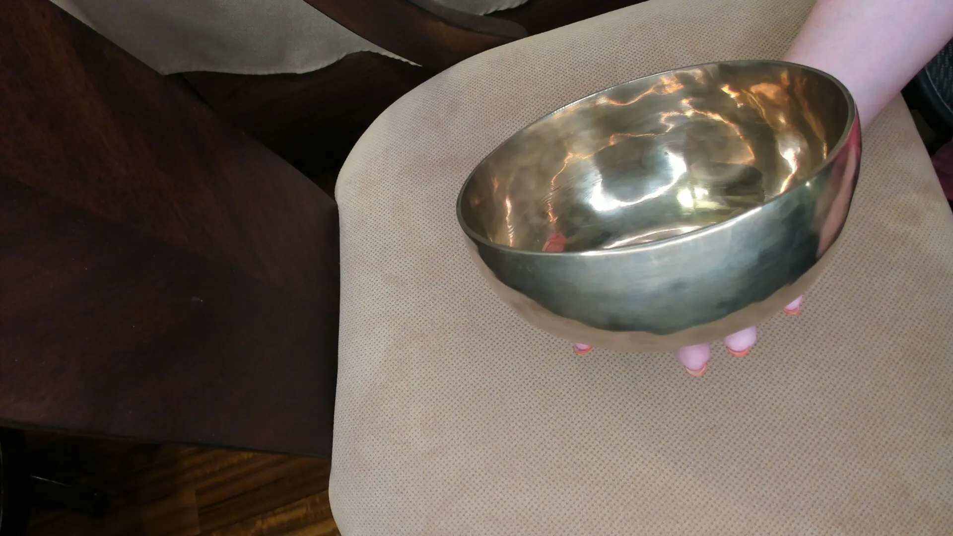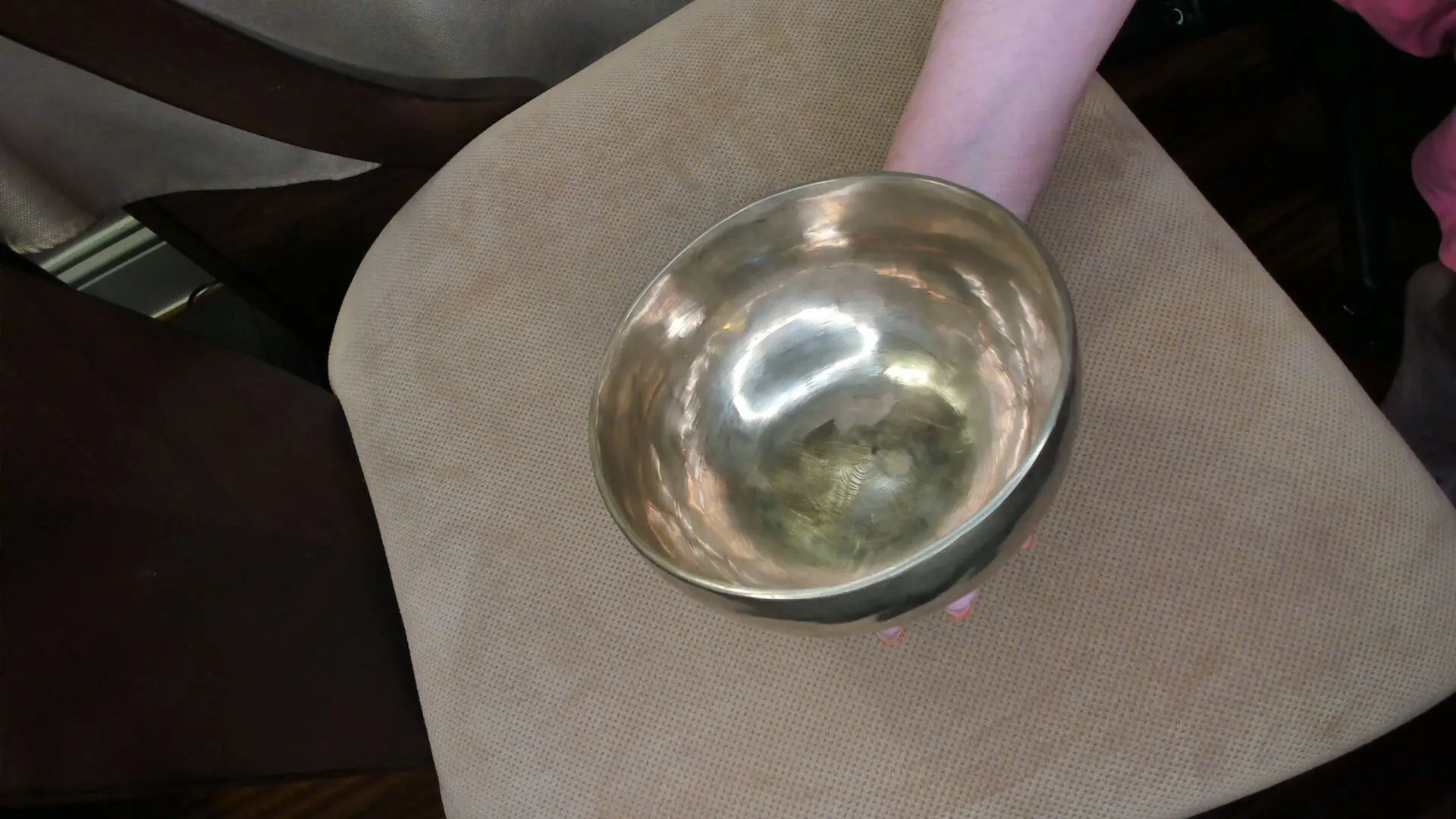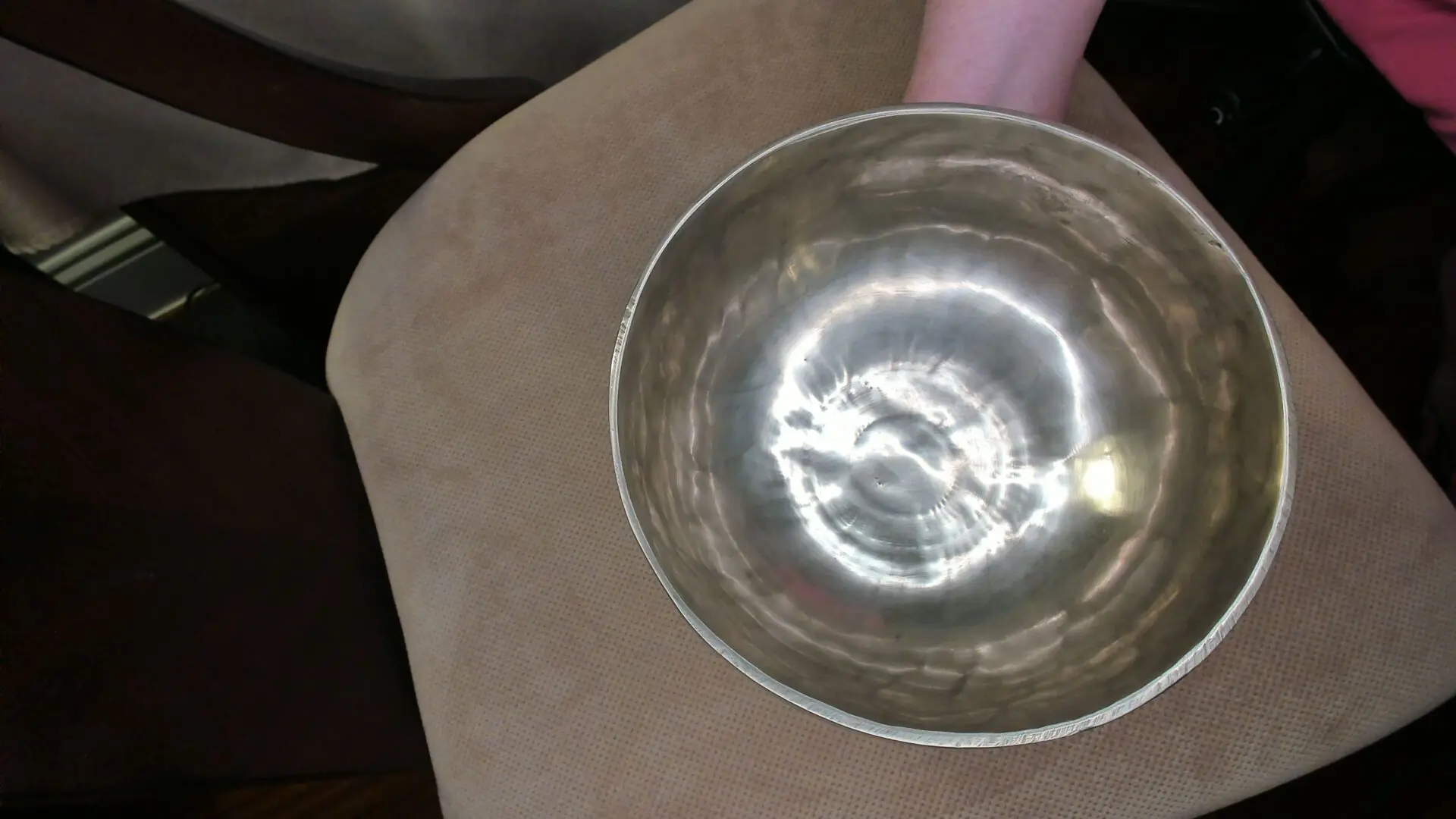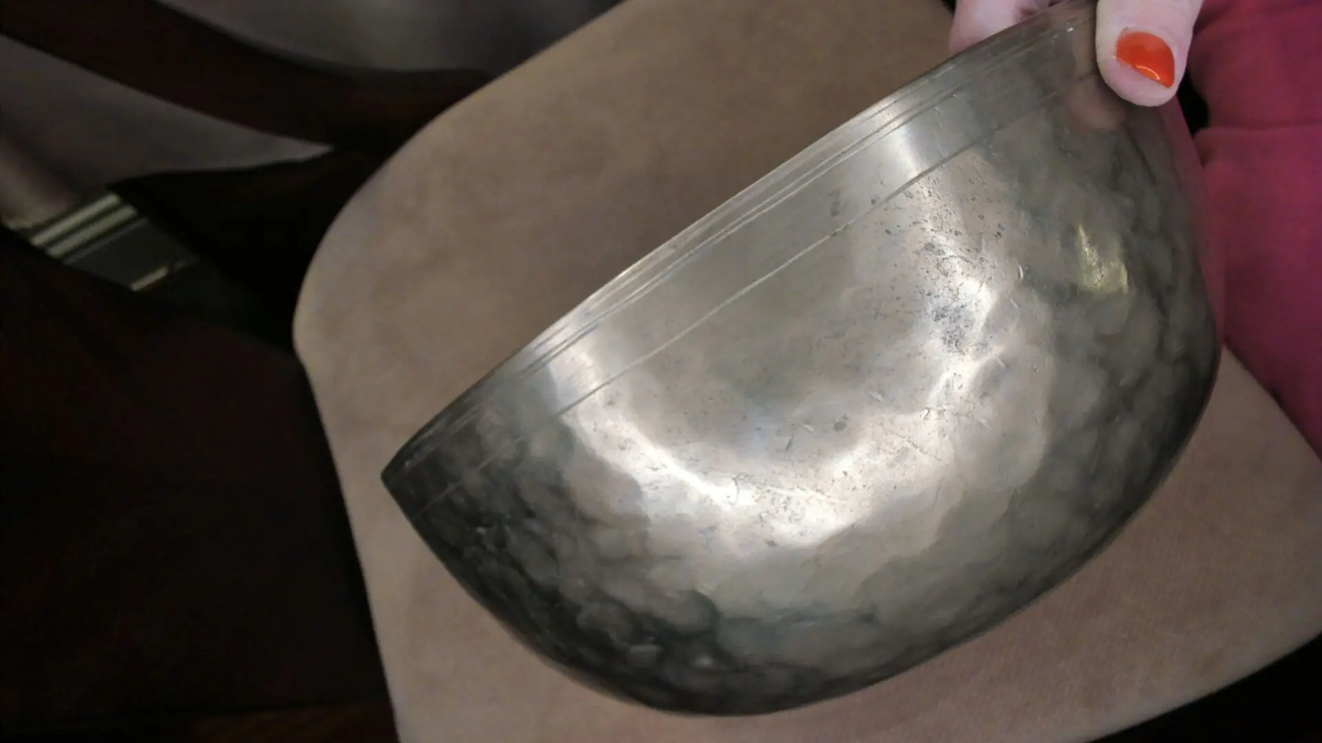 This inner shiny 11 inch diameter bowl is shaped with thicker walls and holds its vibration unattended. Sound in video has two different mallet examples of its soundscape. Listen with headphones for live vibrational reproduction of soundscape .