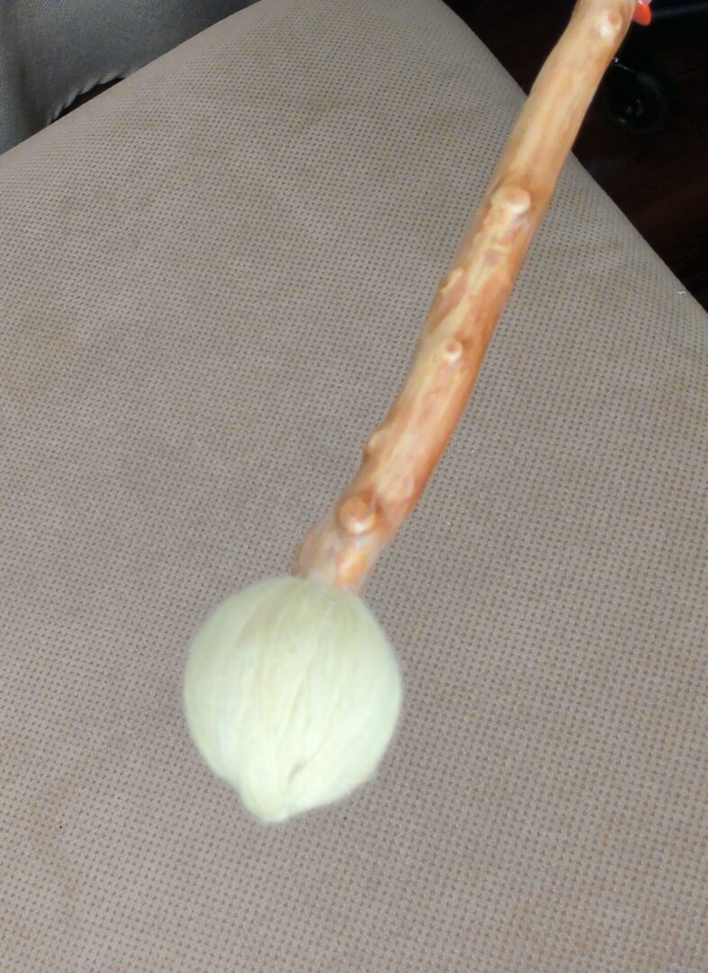 This one-of-a- kind mallet is hand made using wood from the land at 7500 feet altitude at the Acutonics Institute near Taos, NM.  It has a varnished wood handle and a yarn ball that works well on Tibetan style singing bowls to produce a melodious sound.