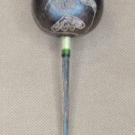 This large Peruvian gourd style rattle has the carved image of a flower on one side and a hummingbird on the other side.