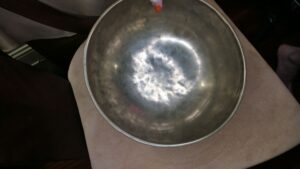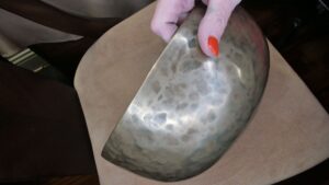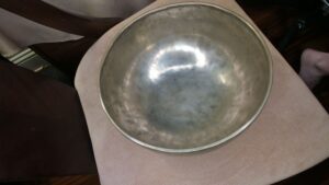Each hand made bowl has imperfections unique to that bowl in appearance. Acutonics recommends you select your bowl by its sound and intended use. This large bowl works as a grounding bowl or on the sacrum. It also fills the room with a sound close to a G note in harmonics or 98.8 Hertz. Your sound reproduction will depend on the mallet used. We recommend the wine yarn mallet or a larger custom yarn mallet for this bowl’s size.