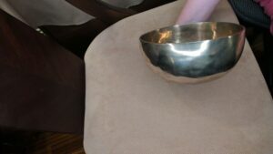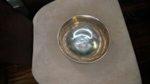 Video shows sound using three different types of mallets. Your sound reproduction depends on what mallet you use and your environment (humidity, temperature, etc). This is a hand-made one-of-a-kind bowl. Great size for on the body chakra use. We like the aqua yarn mallet at start of video.