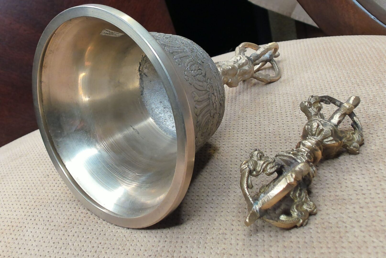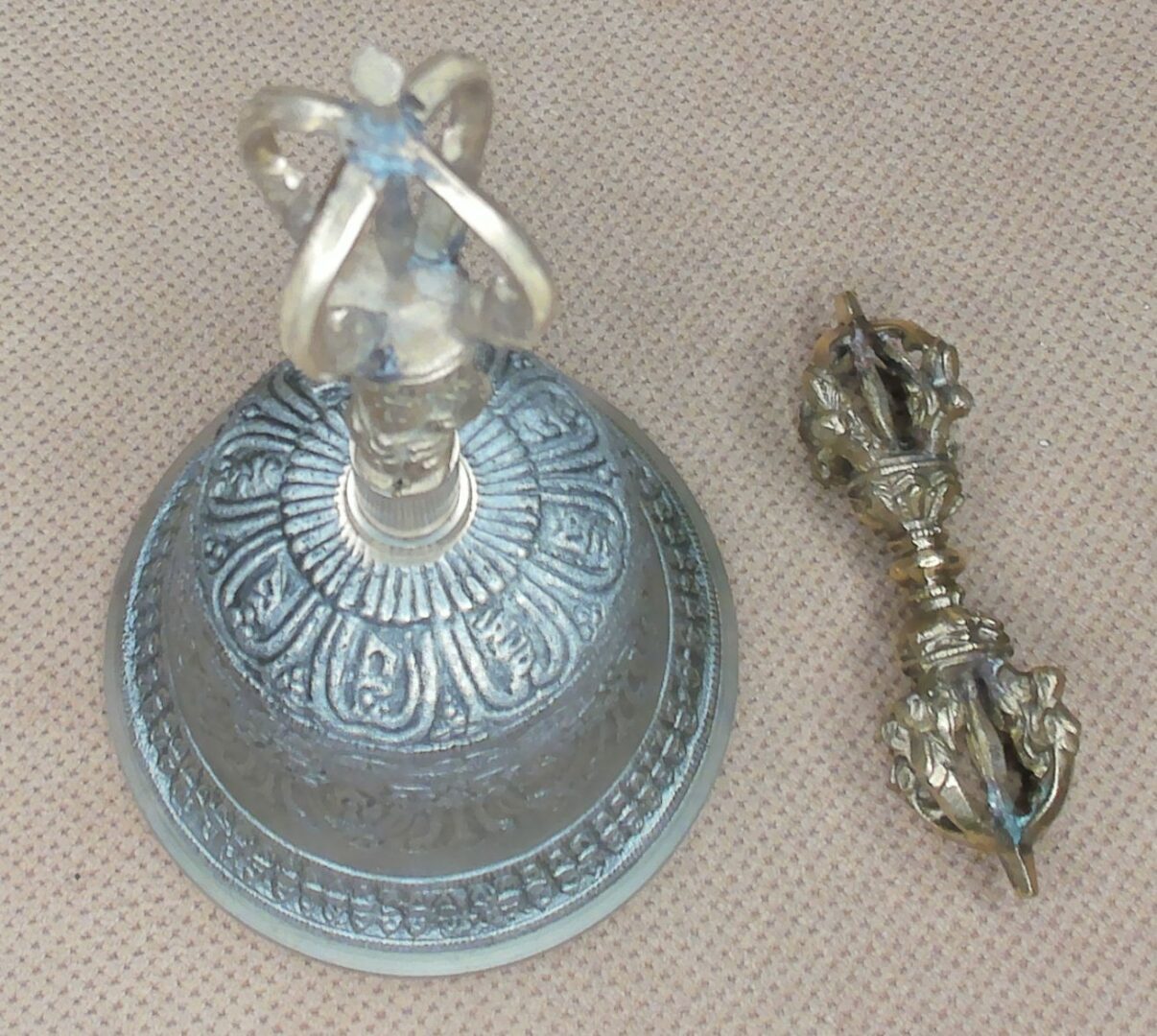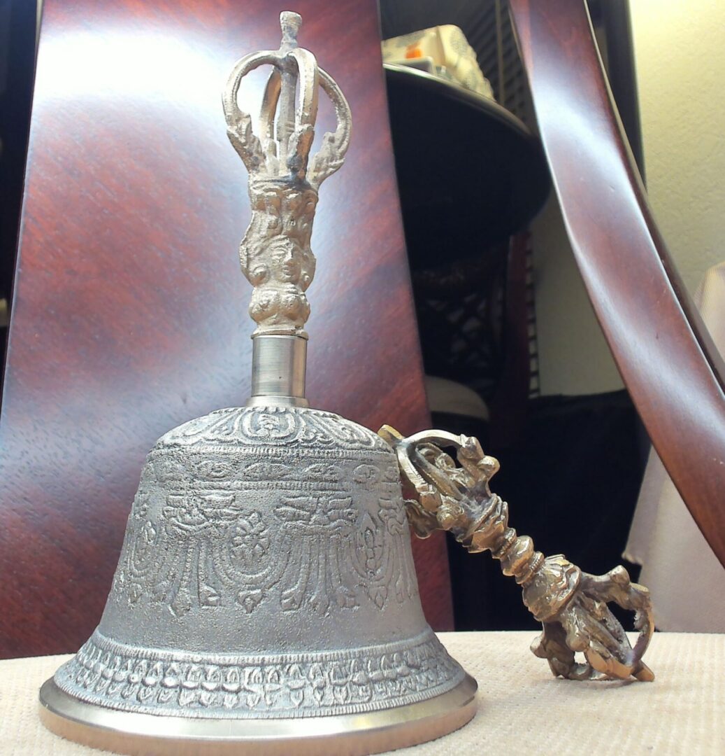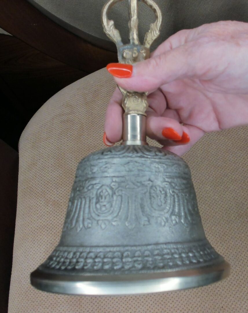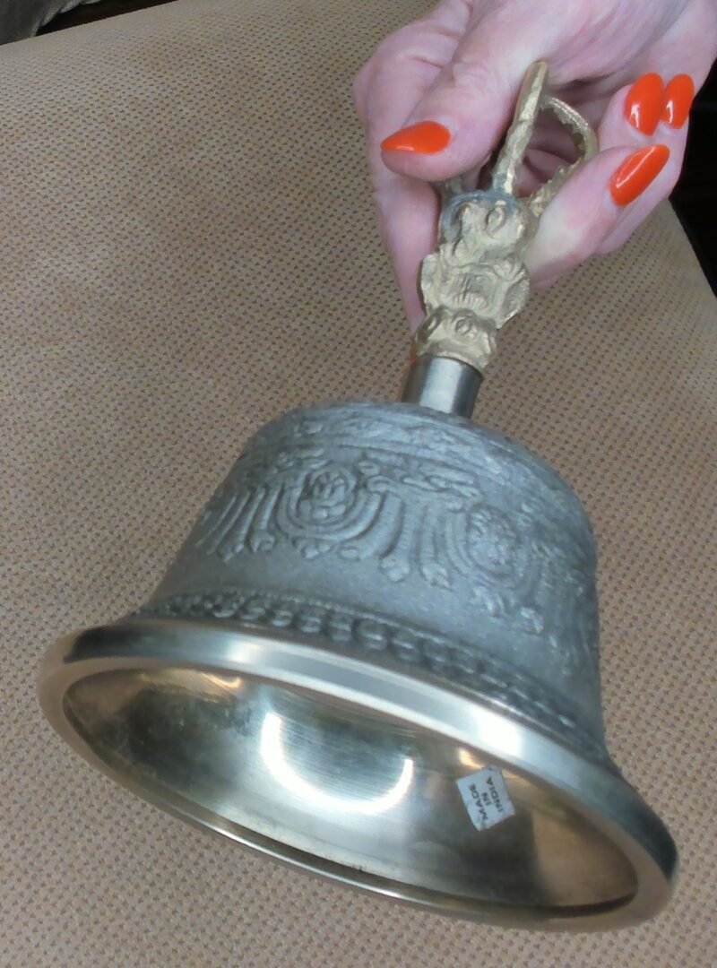 Large size Tibetan Bell made in India.  Measures 4 1/4 inches in diameter and is 7 7/8 inches high.  This bell rings a high C (6) note approximately and ranges in 1022.5 Hertz.   Perfect for clearing chakras, environments or shifting energy.