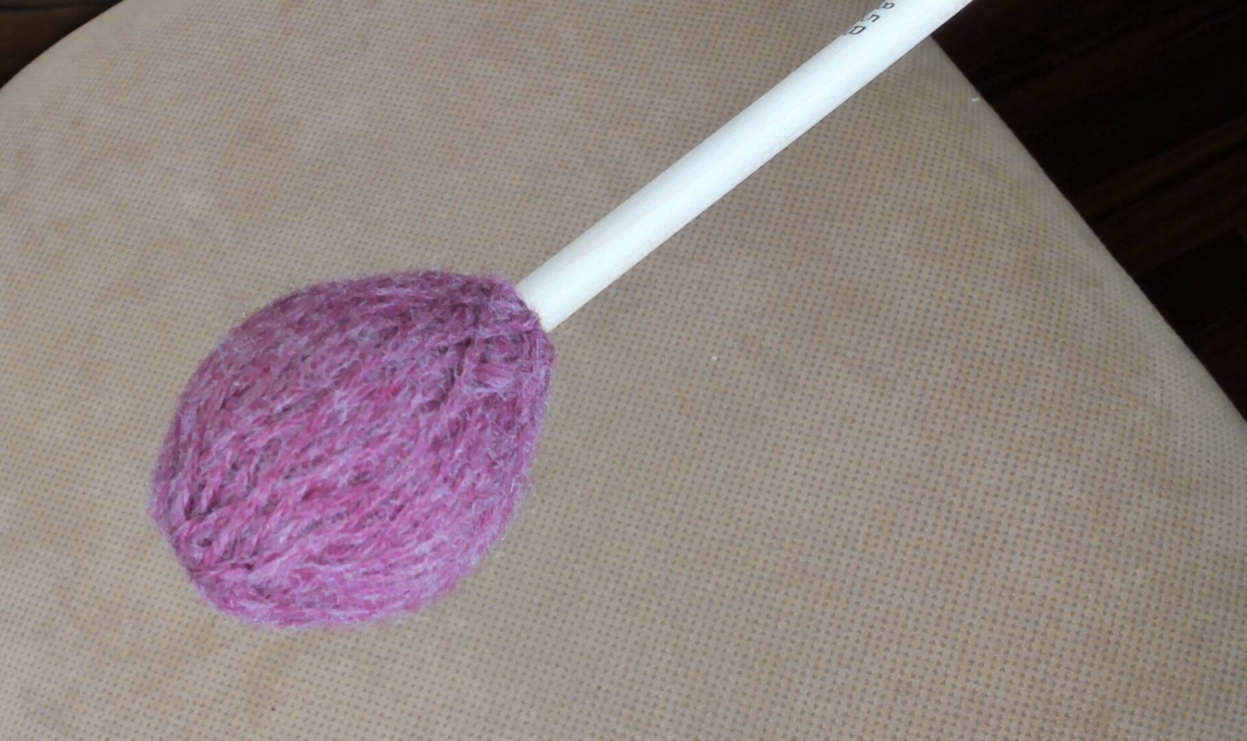This wine colored yarn mallet is 16 1/4 inches long. The length is perfect for reaching singing bowls under your session table without much bending. This allows you to work on your client with tuning forks or other modalities (massage, Reiki, acupuncture, etc) while the bowls vibrate up through the table and play themselves out.